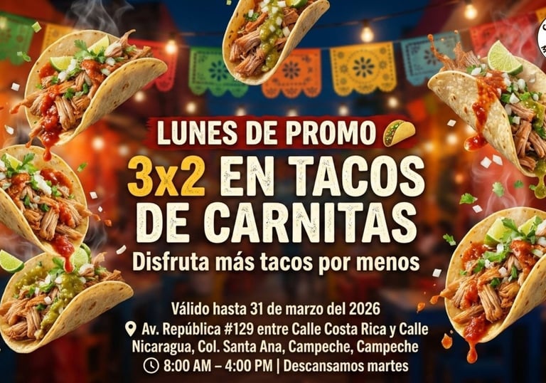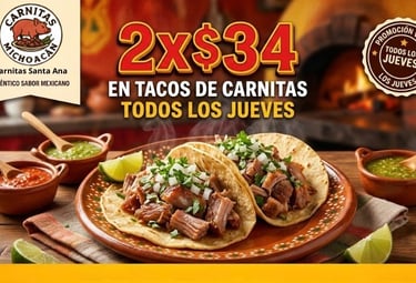 En Carnitas Michoacán Santa Ana tenemos una promoción especial que disfrutes mas por menos: 3 tacos por el precio de 2.
